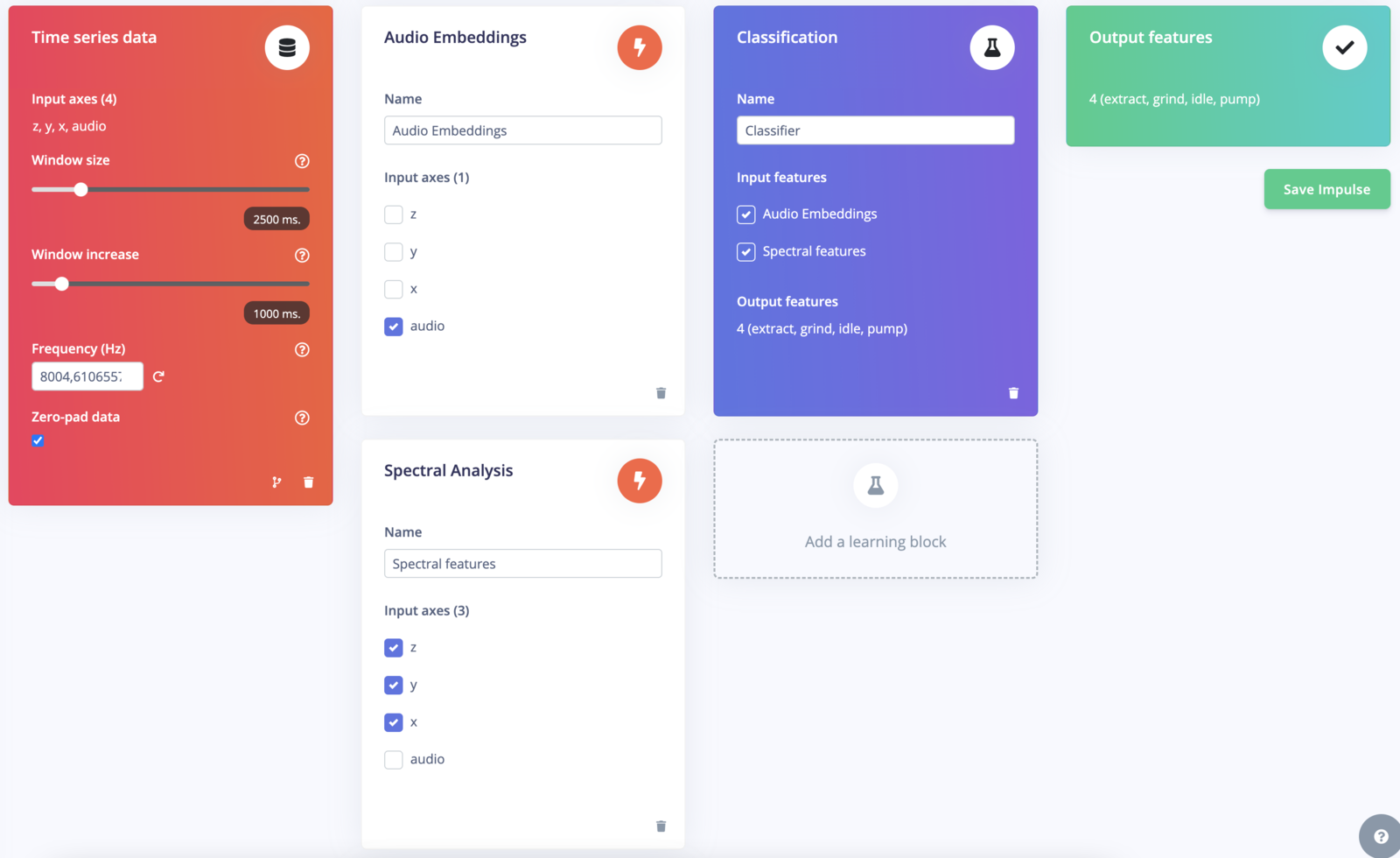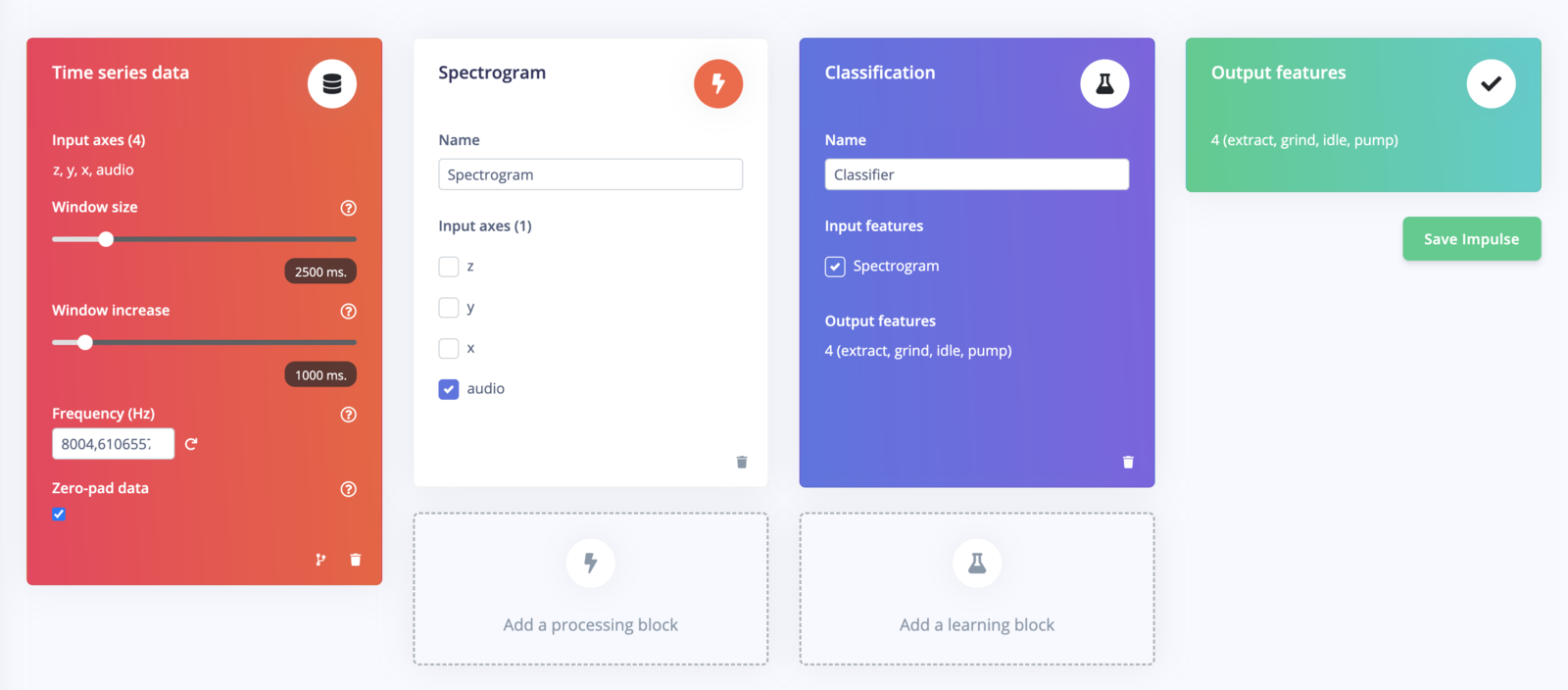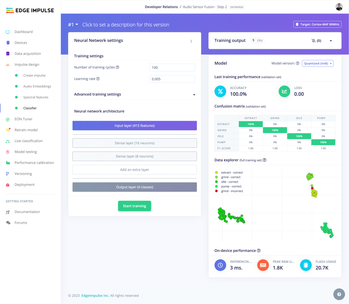 Here’s how we approach advanced sensor fusion with Edge Impulse. In this workflow, we will show how to perform sensor fusion using both audio data and accelerometer data to classify different stages of a grinding coffee machine (grind, idle, pump and extract). First, we are going to use a spectrogram DSP block and a NN classifier using two dense network. This first impulse will then be used to generate the embeddings and will be made available in a custom DSP block. Finally, we are going to train a fully connected layer using features coming from both the generated embeddings and a spectral feature DSP block.