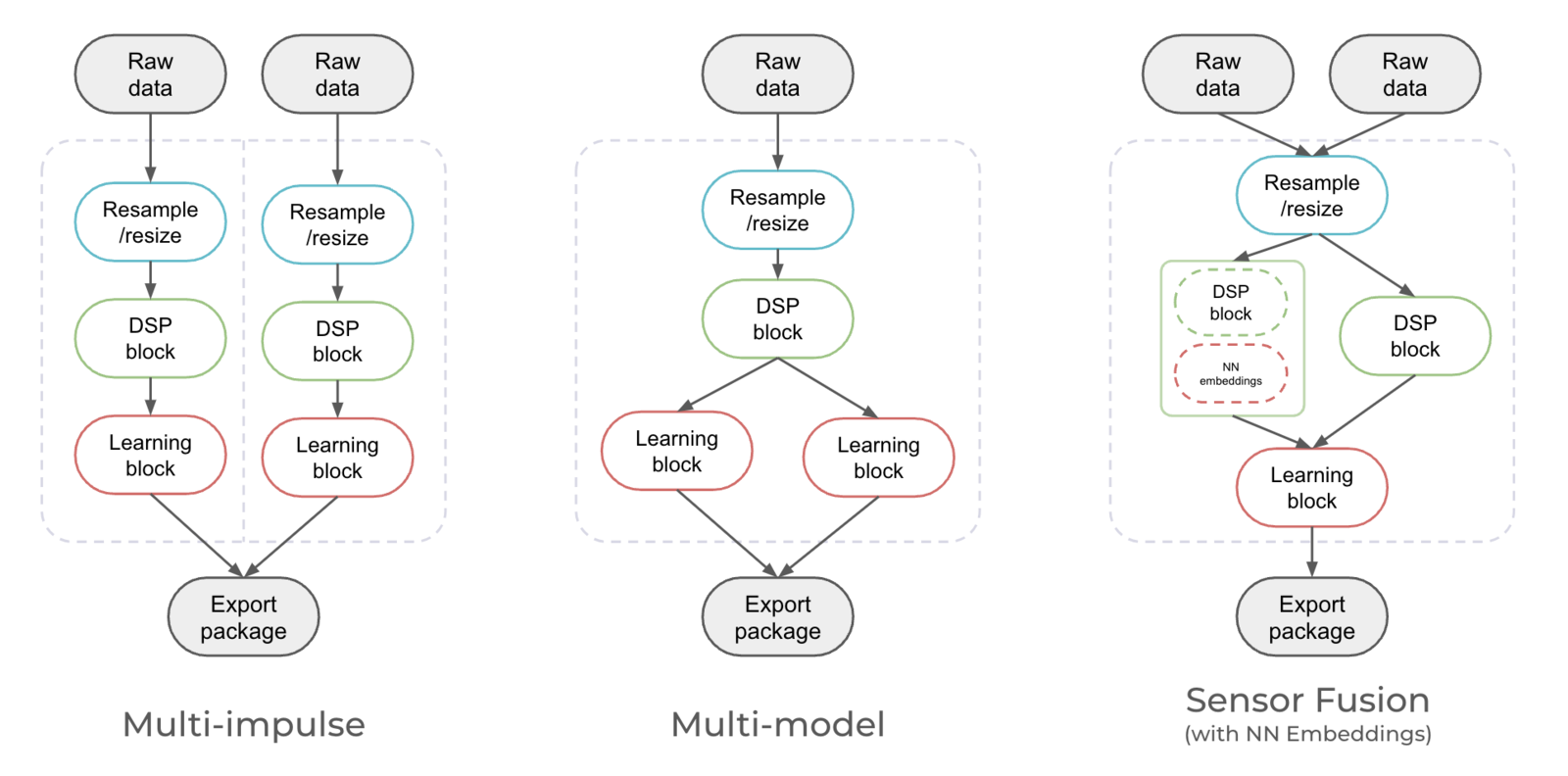 Multi-impulse vs multi-model vs sensor fusionRunning multi-impulse refers to running two separate projects (different data, different DSP blocks and different models) on the same target. It will require modifying some files in the EI-generated SDKs.Running multi-model refers to running two different models (same data, same DSP block but different tflite models) on the same target. See how to run a motion classifier model and an anomaly detection model on the same device in this tutorial.Sensor fusion refers to the process of combining data from different types of sensors to give more information to the neural network. See how to use sensor fusion in this tutorial.