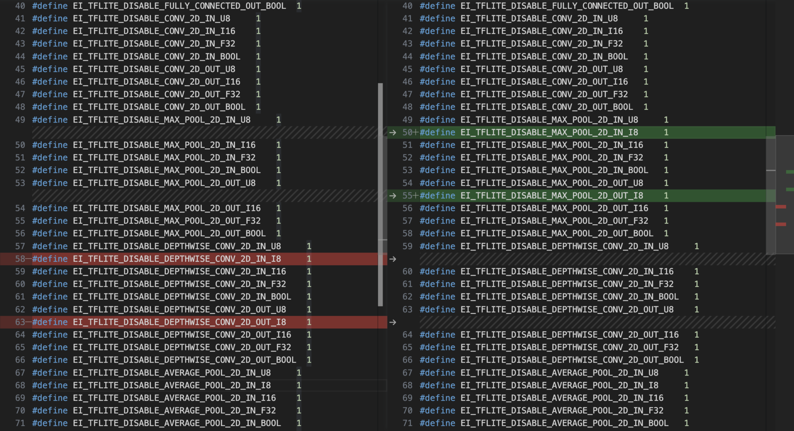Make sure the macrosEI_TFLITE_DISABLE_... are a COMBINATION of the ones present in two deployments.For EON-compiled projects:E.g. if #define EI_TFLITE_DISABLE_SOFTMAX_IN_U8 1 is present in one deployment and absent in the other, it should be ABSENT in the combined trained_model_ops_define.h.For non-EON-Compiled projects:E.g. if resolver.AddFullyConnected(); is present in one deployment and absent in the other, it should be PRESENT in the combined tflite-resolver.h. Remember to change the length of the resolver array if necessary.In this example, here are the lines to deleted: