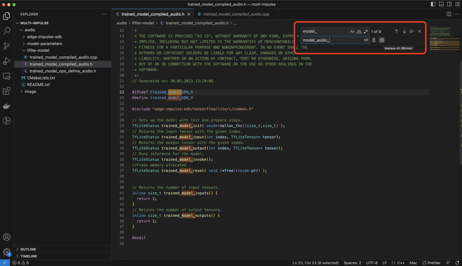 Be careful here when using the “find and replace” from your IDE, NOT all variables looking like _model_ need to be replaced.Example for the audio project:Merge the files