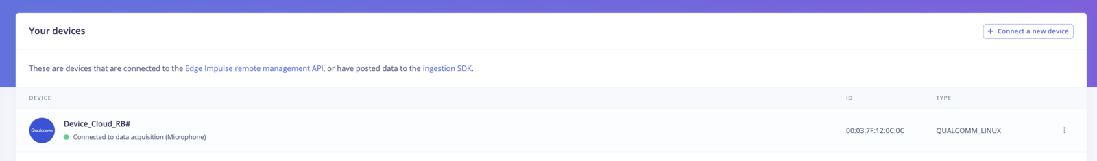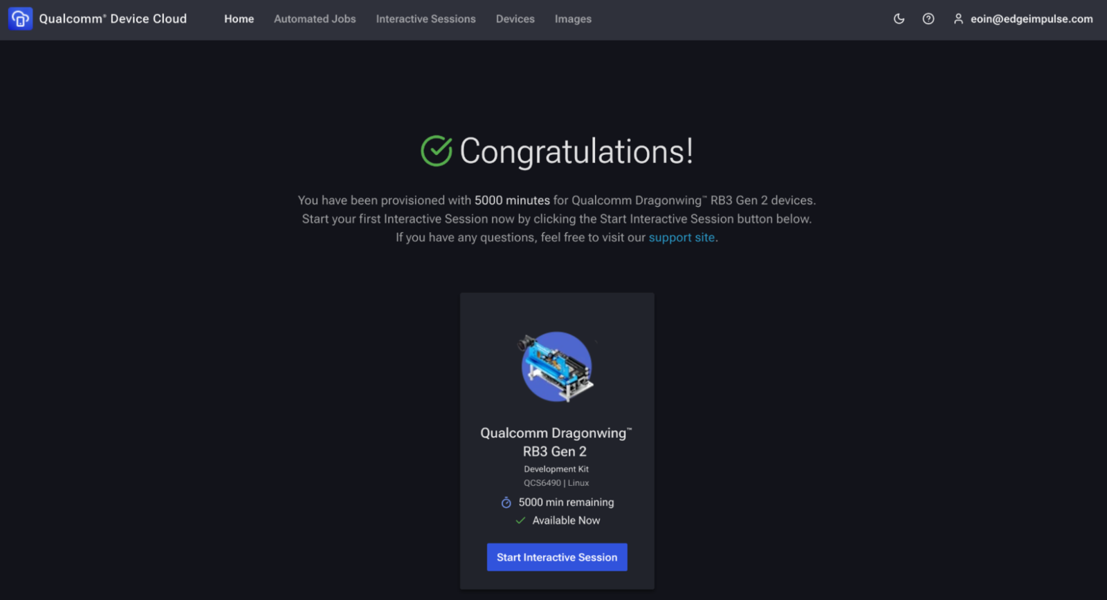 You now have access to a virtual RB3 Gen 2 in Qualcomm Device Cloud, installed the Edge Impulse CLI, connected the board to Edge Impulse Studio, and ran AI inference on a static test image without physical hardware on your desk.Next steps