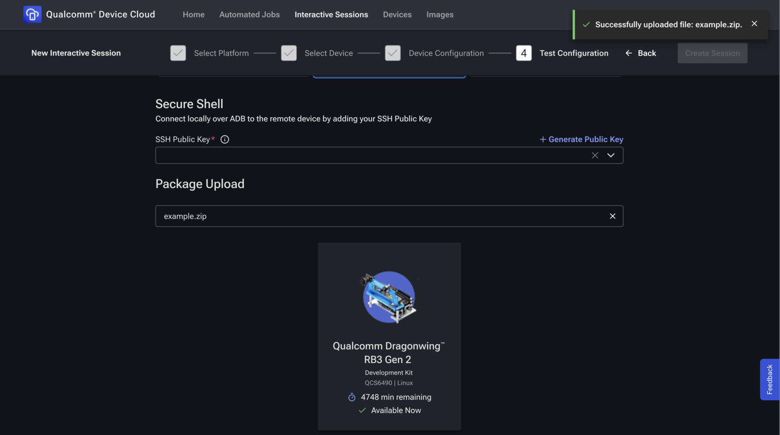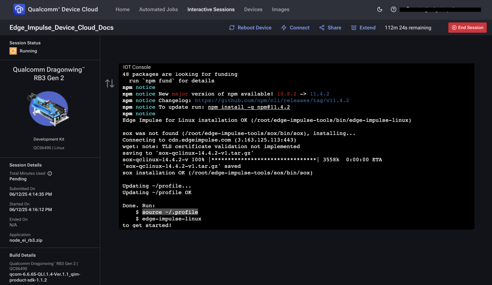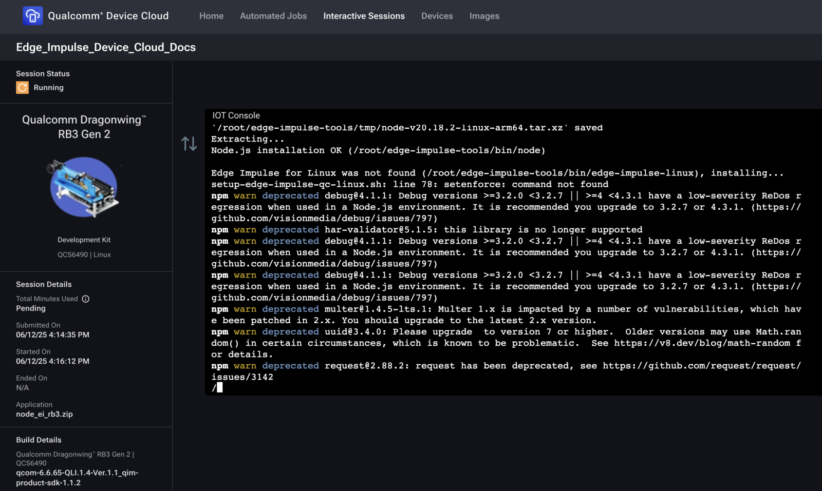 - Log in to QDC > Devices > IoT > RB3 Gen 2 > Start Interactive Session.