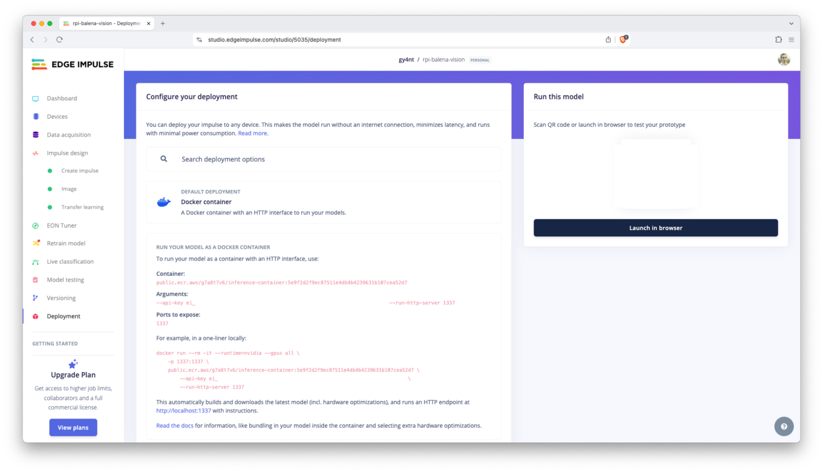 Go to your Edge Impulse project, navigate to the Deployment section and select Docker container as the deployment option. Follow the instructions to generate the Docker container command. It will look something like this: