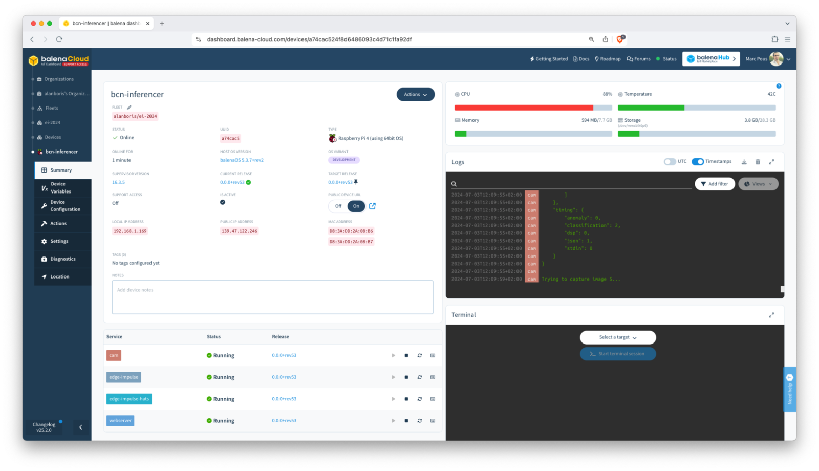 With your Edge Impulse inference server running on balena, now you can monitor and manage the other services running on your device fleet using balenaCloud’s dashboard and tools. This includes monitoring device health, deploying updates, and rolling back changes if needed.