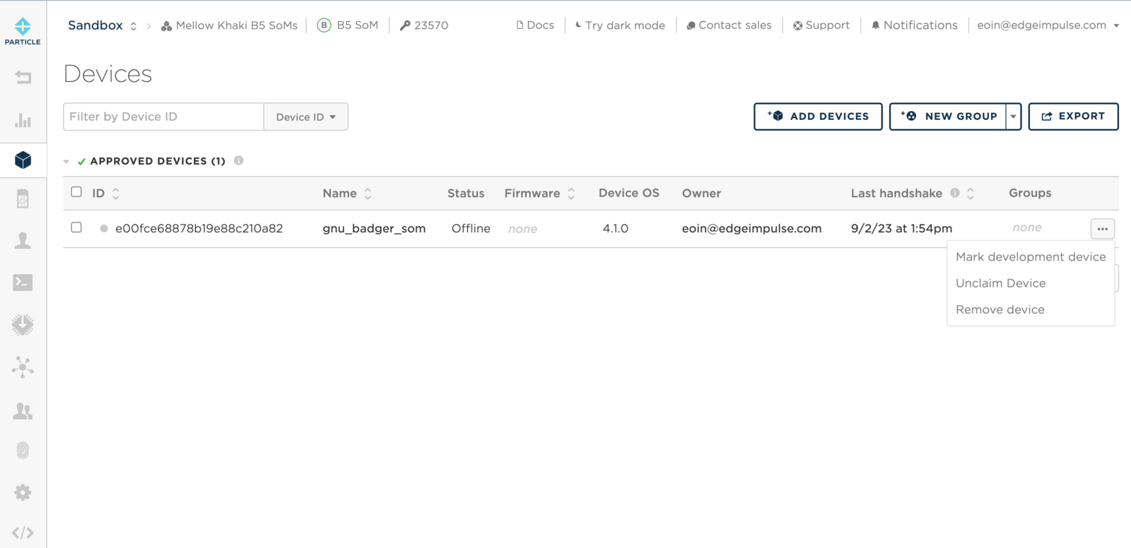 You will need to have a device deployed with an existing firmware containing an impulse before you can roll out a new version. Then you can use the OTA workflow to update the firmware on your device to a new version. While blocking all other devices from updating to the new version.Step 1: Testing on Development Devices