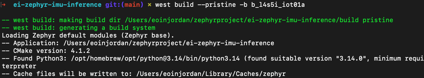 Any IMU supported in Zephyr should work, the example included uses a ST sensor hat. If you want to modify this example to use another board with an integrated IMU like the nicla vision. First comment out the CMAKE declaration for the shield in ei-zephyr-imu-inference/CMakeLists.txt:1. Initialize the Repository